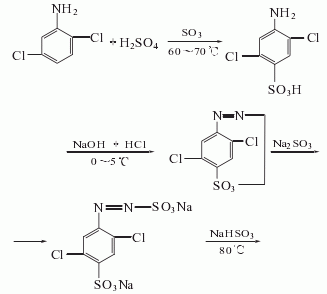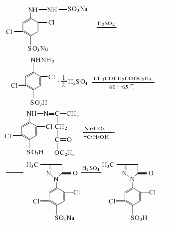 after sulfonation of 2,5-dichloroaniline, it is diazotized with sodium nitrite. the diazonium salt is reduced by sodium sulfite and sodium bisulfite to obtain 2,5-dichloro-4-sulfonic acid phenylhydrazine sulfonate sodium salt, which is acidified with sulfuric acid to form sulfate, and then condensed with ethyl acetoacetate, and neutralized with soda ash and remove the ethyl ester, and then acidify to obtain the finished product.