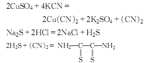 1. add concentrated ammonia water to concentrated copper sulfate solution while stirring until the precipitated copper hydroxide is redissolved. after cooling, slowly add potassium cyanide solution with constant stirring until the blue color disappears. then hydrogen sulfide gas produced by the reaction of sodium sulfide and hydrochloric acid is passed into the reaction liquid. control hydrogen sulfide: cyanide gas = 3: 1, stir evenly, cool completely, let it stand, and filter. the obtained crystals are washed with cold water and recrystallized with ethanol to obtain the finished product