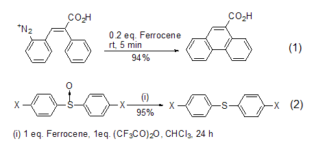ferocene itself is a good reducing agent and can participate in many redox reactions. for example, it can be used as a single-electron homogeneous catalyst to catalyze the pschorr cyclization reaction, which would otherwise require the reaction of several hours is completed within a few minutes, and a higher yield is obtained (formula 1)[1]. it can also reduce sulfoxide to sulfide in the presence of trifluoroacetic anhydride. (formula 2)[2].