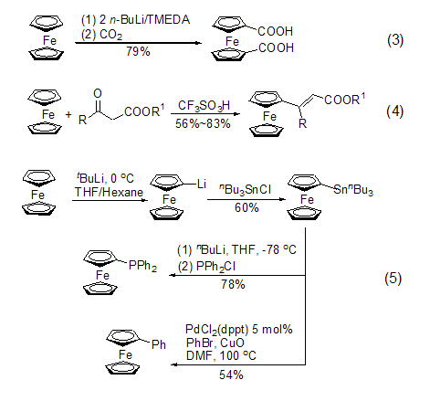 by activating the cyclopentadiene ring of ferrocene, a series of derivatives can be prepared (formula 3[3], formula 4[4], formula 5 [5] ), some of the derivatives with planar chirality can be used as chiral ligands to coordinate with other metals to form chiral catalysts. already realized reactions such as the asymmetric diels-alder reaction[6,7], asymmetric allylation reaction[8,9], and some other asymmetric functionalization reactions[10] .