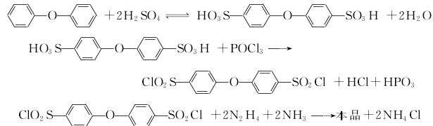 use diphenyl ether and excess chlorosulfonic acid (molar ratio about 1:6) to react at room temperature for 2 hours then pour it into water and filter to obtain the crude intermediate 4,4′-chlorobisphenylsulfonyl chloride. diphenyl ether was sulfonated with approximately the same amount of concentrated sulfuric acid under vacuum and 135°c for 4 hours, then refluxed with an equal amount of phosphorus oxychloride for 3 hours, poured into ice water, separated, filtered, washed, filtered and dried. get intermediate. the intermediate is reacted with a slight excess of hydrazine hydrate and an equivalent amount of ammonia water at 30 to 40°c for 3 hours, and finally the product is filtered, washed, and dried to obtain the product.