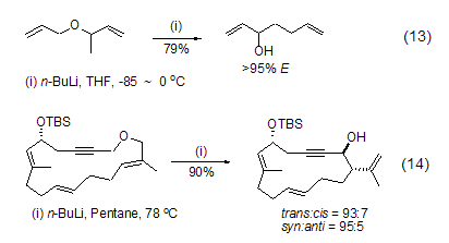 n-butyllithium is also often used in anion rearrangement reactions. for example, allyl ether or propargyl ether undergoes 2,3-wittig rearrangement under the action of n-butyllithium. the reaction usually first obtains anions through α-deprotonation reaction or li-sn exchange reaction at low temperature, and then the temperature is raised to cause intramolecular rearrangement (formula 13, formula 14)[13,14 ].