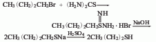 originated from the reaction of butyl bromide and thiourea. thiourea and butyl bromide were heated and refluxed in methanol solvent for 3 hours. after methanol was recovered, dilute alkali solution was added and reflux continued for 6 hours. cool and slowly add 1:2 dilute sulfuric acid to ph 2. with the addition of dilute sulfuric acid, butanethiol will evaporate. after adding sulfuric acid, steam distillation until no oil beads are distilled. separate the oil layer, dry it with anhydrous calcium chloride, fractionate and collect the 97-98°c fraction as the finished product.