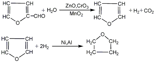 (7) in the presence of zinc oxide, chromium oxide, and manganese dioxide, furfural can be catalytically deformed, and hydrogenated in the presence of nickel-aluminum catalyst to form tetrahydrofuran: