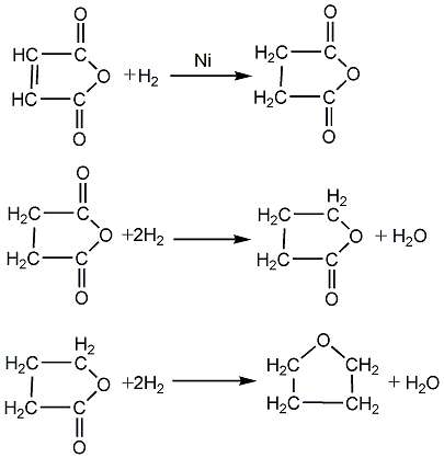 maleic anhydride and hydrogen enter the reactor equipped with a nickel catalyst from the bottom. the ratio of tetrahydrofuran and γ-butyrolactone in the product can be controlled by adjusting the operating parameters. the reaction product and raw material hydrogen are cooled to about 50°c and enter the bottom of the washing tower to separate the unreacted hydrogen and gaseous products from the liquid products. the unreacted hydrogen and gaseous products are washed and recycled to the reactor. the liquid products are distilled to obtain tetrahydrofuran products. .