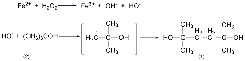 in 5l container equipped with stirrer and thermometer in a four-neck reaction bottle, add 1500ml of water, 28ml of concentrated sulfuric acid, and 900ml of tert-butanol (2) (702g, 9.47mol). after replacing the air with nitrogen, cool it to 10°c in an ice bath. add two solutions simultaneously while stirring: 86ml. (1mol) 35% hydrogen peroxide (5% ~ 50%): a solution of 278g (1.0mol) ferrous sulfate pentahydrate, 570ml water, and 55.5ml (1.0mol) concentrated sulfuric acid. control the temperature below 20°c and complete the addition in 20 minutes. after the addition is completed, add 50 ml (1.0 mol) of 52% sodium hydroxide solution dropwise with stirring. then add 450g of anhydrous sodium sulfate to keep the reaction system below 20°c. separate the organic layer and neutralize it to ph 7 with 52% sodium hydroxide solution. the aqueous layer was extracted with 400 ml of tert-butanol, and neutralized to ph 7 with 52% sodium hydroxide. combine the resulting aqueous phases and extract with 400 ml of tert-butyl alcohol. the four organic layers were combined and concentrated under reduced pressure until there was no tert-butyl alcohol (70°c/665pa). the residue was extracted with 2l ether and decolorized with activated carbon. recover diethyl ether to obtain light yellow crystal ①(1) 30-45g, with a yield of 41%-62% (calculated as hydrogen peroxide). the product was boiled with 30 ml of diethyl ether and 70 ml of cyclohexane, and filtered to obtain 29 to 34 g of white crystals, with a yield of 40% to 46%. it can be further purified by recrystallization, ethyl acetate 1:4, cyclohexane 1:20, water 1:2. note: ① using similar synthesis methods, the following compounds can be synthesized: tetramethyladipic acid is synthesized from pivalic acid, tetramethyltetramethyltetramethyldiamine is synthesized from tert-butylamine, and tetramethylhexane is synthesized from pivalonitrile. dinitrile. [1]