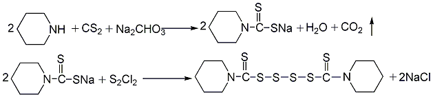 sodium pentamethylene dithiocarbamate is prepared from the reaction of hexahydropyridine, sodium carbonate and carbon disulfide, and then treated with sulfur monochloride to obtain bispentpentane tetrasulfide methylenethiuram.
