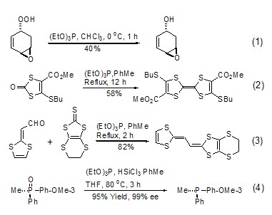 2. preparation of phosphorus acid cheese (arbuzow reaction). deoxidizer and desulfurizer. deoxygenation of hydroperoxides, peroxydiaroyl peroxides, epoxides, isocyanates, and deoxygenation of 1 and 2-diones to produce alkynes. reduction of nitrogen-containing functional groups. desulfurization of episulfides, mercaptans, and disulfides. reduction of α-keto acid to α-hydroxy acid. it reacts with α-halogenated aldehydes and ketones to form dialkyl vinyl phosphates (perkow reaction).