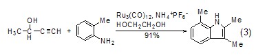 ethylene glycol can also be synthesized as solvent for condensed ring compounds, for example, under the catalysis of ru catalyst, an alkyne derivative reacts with a substituted aniline to synthesize an indole ring[7]. compared with traditional methods, the reaction conditions of this method are milder (equation 3).