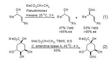 due to the special structure of vinyl acetate, the acetyl group shows higher reactivity. moreover, many biological enzymes can catalyze the acetyl transfer reaction between vinyl acetate and other alcohols to generate new acetate esters. acetyl transfer reactions catalyzed by biological enzymes are generally carried out under very mild conditions and exhibit a high degree of stereoselectivity and regioselectivity. for example: using racemic alcohol and vinyl acetate to react under the catalysis of a suitable biological enzyme, only one enantiomer is selectively ethyl esterified, thereby achieving the purpose of chiral resolution (formula 1) [1~4]. another example: when a molecule containing multiple hydroxyl functional groups reacts with vinyl acetate under the catalysis of a suitable biological enzyme, only one hydroxyl group is selectively ethyl esterified, making the regioselective reaction of a complex system extremely simple (equation 2 )[5,6].