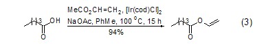although vinyl acetate is used in many under such catalytic conditions, vinyl transfer reactions can occur with other acids to generate new vinyl esters[7]. however, vinyl transfer reactions using metallic iridium catalysts have recently been reported to give very satisfactory results (equation 3)[8].