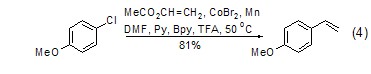 under the action of transition metal catalyst , using simple chemical reactions [9] or electrochemical reaction conditions [10], vinyl acetate can undergo an arylation reaction of olefins with halogenated aromatic compounds. interestingly, good results can also be obtained using chlorinated aromatics in this reaction (eq. 4).