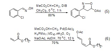 ethylene in vinyl acetate molecule the [2+3][11,12] or [2+4][13] reaction of heteroatoms occurring in the base has relatively important synthetic significance (formula 5) . recently, it was reported that a cross-coupling reaction between vinyl acetate and acrylate was catalyzed by metal palladium, and the diene product was obtained with high yield and high selectivity. this is a result worthy of attention (formula 6)[14 ].