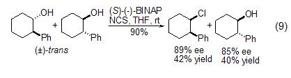 chlorine of alcoholic hydroxyl group in addition to n-chlorination of amines, ncs can also undergo chlorination at the hydroxyl site with alcohol compounds. in the presence of a chiral catalyst, ncs can selectively react with a certain configuration of chiral alcohols, thereby achieving the resolution of alcohols (formula 9)[13].