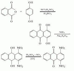 1,4-dihydroxyanthraquinone is obtained by condensation of hydroquinone and phthalic anhydride, and then ammoniated to obtain 1,4-diaminoanthraquinone leuco body, which is then oxidized with fuming sulfuric acid. raw material consumption quota: phthalic anhydride 2131kg/t, hydroquinone 887kg/t, ammonia (20%) 10788kg/t, oleum 3580kg/t.