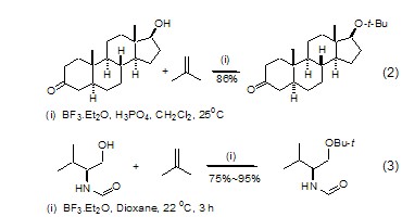 isobutylene can react with a a series of reactions between alcohols and phenols yield the corresponding tert-butyl ethers. tert-butyl ether is stable to most reagents but will decompose when exposed to strong acids. propargyl alcohols, sterol alcohols and phenols can all be protected by isobutylene, and it can also protect derivatives of valine and serine and the hydroxyl group in tyrosine (formula 2, formula 3)[3,4].