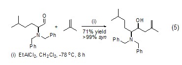 ene-forming reaction in the presence of lewis acid, isobutylene can react with various alkoxy aldehydes, dialkylamine aldehydes, halogenated aldehydes and vinyl sulfoxides to obtain ene (formula 5)[6]. chiral organoaluminum and organotitanium reagents can obtain isomerized products in high yields in the reaction of isobutylene and active aldehydes.