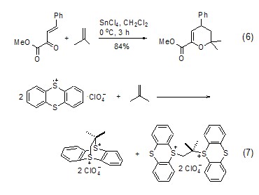 other acid-catalyzed cycloadditions isobutylene can obtain pyran salts and alkylene oxides through the [2+2] cycloaddition reaction under the catalysis of boron trifluoride, and through diels-alder reaction can also obtain 3,4-dihydropyran (formula 6)[7]. isobutylene can also undergo cycloaddition reaction with perchlorate of thianthrene (formula 7)[8].