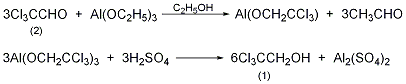 in a reaction flask equipped with a stirrer and a high-efficiency fractionation column, add 250g (1.7mol) of anhydrous trichloroacetaldehyde (2), 700ml of anhydrous ethanol, and 75g of aluminum ethoxide (0.46mol), and heat to boiling , slowly fractionate the acetaldehyde generated, and the reaction ends in about 24 hours. the ethanol is recovered to dryness, and finally the ethanol is distilled under reduced pressure. cool, slowly add 20% sulfuric acid, and steam distill. separate the oil layer. the aqueous layer was saturated with sodium sulfate and extracted three times with diethyl ether. the ether layer and oil layer were combined and dried over anhydrous sodium sulfate. recover diethyl ether, distill under reduced pressure, and collect fractions at 94-97°c/17kpa to obtain 215g of 2,2,2-trichloroethanol (1), yield 84%, solidified after cooling, mp 16-18°c. [4]
