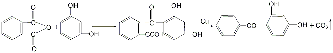 4. combine phthalic anhydride and isophthalic anhydride diphenol is added to the reaction kettle, and then solvent quinoline and catalyst copper powder are added to perform a condensation reaction to obtain 2-(2′,4′-dihydroxybenzoyl)benzoic acid, which is then decarboxylated to obtain 2,4-dihydroxybenzoic acid. hydroxybenzophenone.