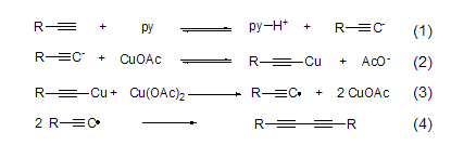 copper acetate has oxidative activity towards carbanions, and can realize the oxidative coupling reaction of terminal alkynes in the presence of pyridine to obtain diyne compounds (formula 1~formula 4)[2] .
