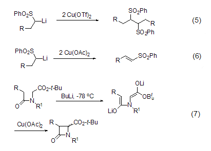 using trifluoromethanesulfonic acid using copper as an oxidizing agent can realize the self-coupling reaction of α-sulfonyl lithium carbon anion (formula 5), ​​but using copper acetate as an oxidizing agent can oxidize it to α,β-unsaturated sulfone compound (formula 6)[3]. other carbanions can also undergo coupling reactions under the action of copper acetate, such as the synthesis of β-lactam (formula 7)[4].