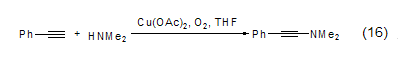 copper acetate also reacts in the presence of oxygen it can catalyze the coupling reaction of phenylacetylene and dimethylamine to obtain n,n-dimethyl-2-phenylacetylene amine compound (formula 16)[13]. oxygen is a key factor in this reaction, and in the absence of oxygen, 1,4-diphenylbutyne is the only coupling product.