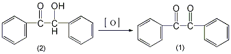 in a 250 ml reaction bottle, add 20 g (0.094 mol) of benzoin (2) and 100 ml of concentrated nitric acid, and heat the reaction in a boiling water bath for about 1.5 hours with stirring until nitrogen dioxide basically no longer escapes. pour the reactant into 400 ml of cold water and stir until the oil solidifies into a yellow solid. suction filter and wash with water. recrystallize from ethanol (1g requires approximately 2.5ml of ethanol) to obtain 19g of pure bibenzoyl (1), yield 96.8%, mp94~96°c. [1]