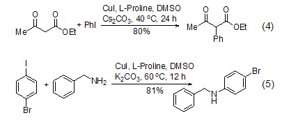 catalyze the synthesis of carbon-carbon and carbon-nitrogen in addition to being a chiral catalyst to catalyze asymmetric synthesis, proline can also be used as a copper ligand to catalyze carbon-carbon synthesis. the formation of bond (formula 4)[14] and carbon-nitrogen bond (formula 5)[15].