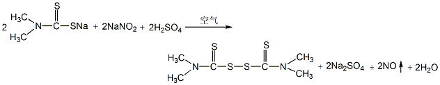 4.add 9g (0.2mol) dimethylamine and 0.23g catalyst into the three-necked flask and stir below 20°c. add 18.04g (0.24mol) carbon disulfide dropwise. after continuing to stir, add 26.8g (0.2mol) 30% sodium hydroxide dropwise. at this time, the solution turns light yellow-green. remove excess carbon disulfide. add sodium hypochlorite at 25-40°c for oxidation and take samples. inspect the end point, filter, wash with water until neutral, and dry to get the finished product.