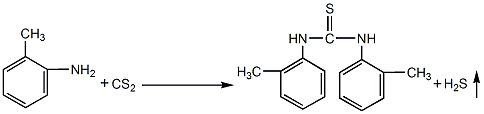 - at room temperature, add 1% sulfur and 1% carbonic acid to the reaction solution composed of o-toluidine, water and a slight excess of carbon disulfide. ammonium hydrogen or ammonia water is used as catalyst. start stirring and perform the reaction under closed conditions. the initial pressure is 0.05~0.1mpa. when the pressure rises, the gas is released regularly, and the released hydrogen sulfide gas is absorbed by liquid alkali. the normal temperature reaction production cycle is long, about 15 days or more in summer.