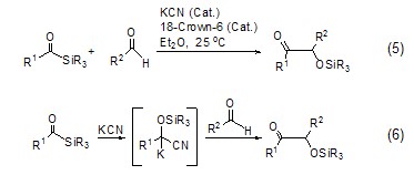 potassium cyanide and 18-crown ether-6 form a catalytic system, which has a strong catalytic effect and can be used for the coupling reaction of carbon-carbon bonds (formula 5)[9], the reaction mechanism is shown in formula 6.