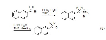 halogenated hydrocarbons react with pph3 to form  salts, hydrolysis in the presence of kcn and heavy water can give high yield of deuterated products (formula 8)[11].