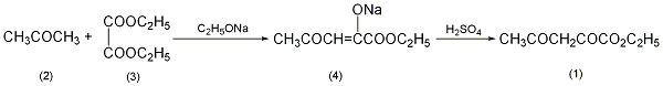 in a reaction flask equipped with a stirrer, reflux condenser and dropping funnel , add 2l of absolute ethanol, and add 63g (2.7mol) of metallic sodium in batches while stirring. after all the sodium has reacted, cool to room temperature. add dropwise a mixture of 365g (2.5mol) of diethyl oxalate (3) and 145g (2.5mol) of acetone (2), and finish adding ① in about 3 hours. after the addition is completed, raise the temperature to 40°c and continue stirring for 1 hour to form a yellow viscous substance. cool, filter with suction, and wash with ethanol to obtain sodium salt (4) ②. add the sodium salt to 1.3g of ice water, slowly add it to the pre-frozen dilute sulfuric acid (prepared with 100ml concentrated sulfuric acid and 200ml water) while stirring, control the temperature of the reaction solution at 0~5°c, adjust to ph 3~4, and continue stirring for 10 minutes , until the yellow sodium salt disappears. extract with benzene (300ml×3), combine the extracts, and wash with water. benzene was recovered by distillation under normal pressure, and then distilled under reduced pressure to collect the fraction at 117~121℃/308kpa to obtain 240g of ethyl acetylacetonate (1)③, with a yield of 61%. note: ① a white precipitate is formed in the early stage of the reaction, then gradually turns yellow, further deepens, and finally turns yellow, and the reaction system gradually thickens. ②suction filtration is very slow, and finally centrifugation is used. ③the product has poor stability and will decompose on its own during storage. [1]