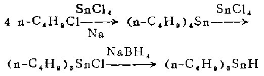 in a 1-liter three-neck flask equipped with a stirrer, reflux condenser and dropping funnel, add sodium sand made of 8 moles of sodium and an appropriate amount of petroleum ether and heat until boiling. under stirring, slowly add a mixture of 1 mole of anhydrous tin tetrachloride and 4 moles of 1-chlorobutane from the dropping funnel for about 30 minutes. the reaction begins quickly, external heating is discontinued, and the heat of reaction brings the mixture to boiling (45-70°c) within 0.5-1.5 hours.