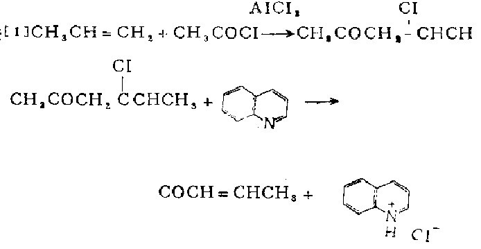 the 2-liter three-neck flask is equipped with an effective mechanical stirrer, a gas input pipe (extending almost to the bottom of the bottle), and a high-efficiency reflux condenser with a calcium chloride drying tube. after drying the instrument in an oven, 800 ml of dry methylene chloride and 157 g (142 ml, 2.0 mol) of acetyl chloride were placed in the bottle. stir the solution and add 320 grams (2.4} mol) powdered anhydrous aluminum chloride portionwise within ].;} minutes. once the addition is complete, a stream of propylene gas is introduced into the continuously stirred reaction solution at a rate sufficient to provide gentle reflux. continue gas flow until no more heat is released and reflux ceases (10-30 hours). at this point, the bottle is nearly full. when the stirring stops, the contents separate into two layers. carefully pour the contents of the bottle onto 1.5 kg of ice. separate the upper organic layer. the aqueous layer was extracted with 3 portions}0} ml of methylene chloride. combine the organic solutions, wash with 50 ml of water, and dry over anhydrous magnesium sulfate. place the obtained dark brown solution in a domestic flask equipped with a thermometer, a magnetic stirrer and a vacuum tin evaporation device, and use a heating mantle to provide heat. while maintaining the mixture at 0°c, the mixture was evaporated under reduced pressure with a water pump. most of what evaporates from the mixture is methylene chloride and volatile hydrocarbons. after most of the solvent is evaporated, a 1-liter round-bottomed flask cooled in a dry ice-isopropyl alcohol bath is connected to the tin evaporation device as a receiver. , reduce the pressure to <lmm. use a heating mantle to provide heat to slowly raise the viscous liquid in the radium evaporator bottle from 0°c to 45°c within 90 minutes. at this time, volatile products (including methylene chloride, low molecular weight hydrocarbons, 4-chloropentene-2-one and 3-pentene-2-one) are distilled out. 400 to 500 grams of light green distillate was obtained, mixed with 256 grams (1i mol) of sodium chloride, and then heated to boiling. in order to remove residual methylene chloride and other low-boiling substances, the mixture is evaporated until the temperature of the distillate rises to 110-120°c. the remaining solution is refluxed for 30 minutes, then cooled, and used with the previously evaporated distillate and dilute with 200 ml of pentane, and wash the resulting solution with several portions of 250 ml of 10% hydrochloric acid aqueous solution until the wash becomes acidic. combine the aqueous solutions and acidify. shake with 3 parts of 100 mg pentane. the organic solutions were combined, washed with 50 ml of saturated sodium bicarbonate solution, and then dried over anhydrous magnesium sulfate. the obtained organic solution is used in a 30 cm long pine needle-shaped fractionation column to collect the 119-124°c fraction. the product weighs 42-63