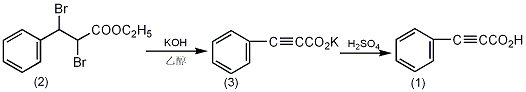 in a reaction bottle equipped with a stirrer and a reflux condenser , add 1.2l of 95% ethanol and 252g of potassium hydroxide (4.5mol), stir to dissolve. cool to 40~50°c, add 336g (1.0mol) of α,β-dibromo-βphenylpropionic acid ethyl ester (2), and heat to reflux for 5 hours after the reaction becomes stable. cool, filter out the precipitate (retained), adjust the filtrate to neutrality with concentrated hydrochloric acid, then filter out the precipitate (retained), and recover ethanol by distillation under normal pressure. combine the residue with the precipitate (3) filtered above, dissolve it in 800 ml of water, and add crushed ice to make it about 1.8l. use 20% sulfuric acid in an ice water bath to make it highly acidic , and a light brown solid will precipitate. filter it with suction and wash with 2% dilute sulfuric acid. dissolve the filtered solid in 1.5l (5%) sodium carbonate, decolorize with activated carbon, filter with suction, cool and add 200g of crushed ice. adjust to strong acidity with 20% sulfuric acid, precipitate the solid, suction filter, wash with 2% sulfuric acid and water in sequence, and dry in a vacuum dryer to obtain 115g of phenylpropinoic acid (1), with a yield of 79%. recrystallize with carbon tetrachloride to obtain 70g of pure product, mp 135~136℃. note: ① when adding sulfuric acid, it should be done at low temperature as much as possible to prevent decarboxylation reaction. [1]