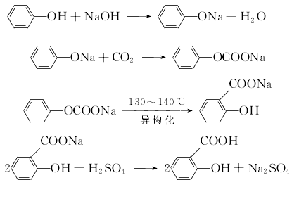 1. phenol reacts with sodium hydroxide to generate sodium phenolate. after distillation and dehydration, carbon dioxide is passed through the carboxylation reaction to obtain salicylic acid sodium salt, which is then acidified with sulfuric acid to obtain the crude product. the crude product is refined by sublimation to obtain the finished product. raw material consumption quota: phenol (98%) 704kg/t, caustic soda (95%) 417kg/t, sulfuric acid (95%) 500kg/t, carbon dioxide (99%) 467kg/t. this method is divided into normal pressure method and medium pressure method. (1) normal pressure method: prepare sodium phenolate with 50% sodium hydroxide solution so that the free base is within 1%. after dehydration under reduced pressure, add phenol as a solvent for azeotropic dehydration. then sodium phenolate is carboxylated by passing dry carbon dioxide into the solvent phenol, and then acidified with sulfuric acid to obtain the finished product.