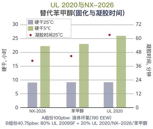ultra lite ultra-light cardanol models nx-2026 and ultra lite 2020 (ul 2020) are renewable and low-volatility alternatives to benzyl alcohol. the formula can be adjusted appropriately according to differences in viscosity and curing performance. chart showing comparison of hard dry time and gel time between benzyl alcohol, ul 2020 and nx-2026 as a formulation reference.