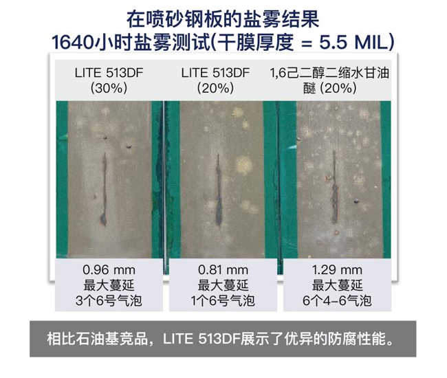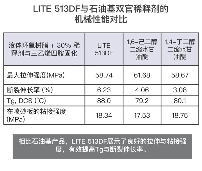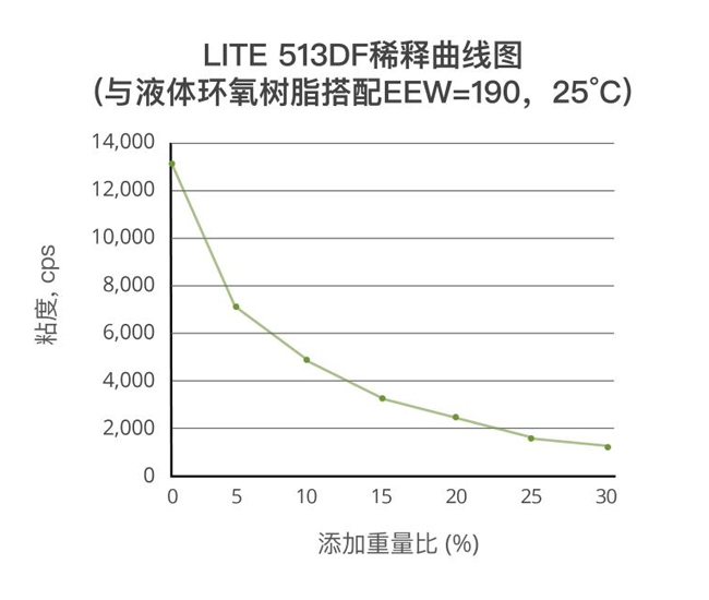 lite 513df is a new high bio-content diluent based on cashew nut shell liquid that has a lower epoxy equivalent weight than the standard 513 model. this product is suitable for epoxy coatings, one- and two-component adhesives and composite materials. lite 513df has low viscosity and excellent dilution ability. the added weight curve with bisphenol a liquid epoxy resin is shown in the figure. as a diluent, it has good hardness development at ambient and low temperatures. similar to other cashew nut shell oil-modified materials, lite 513df has good water resistance and flexibility. in coating applications, lite 513df showed very good anti-corrosion properties in long-term salt spray tests, see the image of the panel on this page. in adhesive applications, this epoxy diluent also acts as a modifier, increasing elongation and bond strength while minimizing effects on tg and tensile strength.