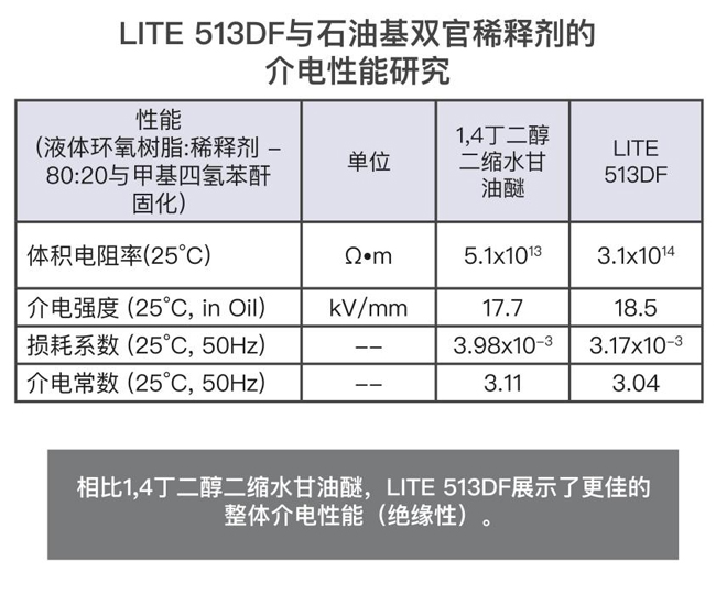 tested according to iec 62631 and iec 60243 standards, lite 513df provides good insulation properties as shown by its dielectric properties. in the formulation of epon 828, the resin is used at 20%, cured with mthpa (methyltetrahydrophthalic anhydride) and catalyzed with bdma (benzyldimethylamine). lite 513df demonstrated excellent results, with higher volume resistivity and dielectric strength, and lower dissipation factor and dielectric constant than competing 1,4-butanediol diglycidyl ether. when both dilute epoxy resin systems are exposed to high temperatures or salt solutions, lite 513df outperforms petroleum-based difunctional diluents. lite 513df is a good epoxy diluent and modifier for electrical potting, casting and encapsulation (impregnating resin).